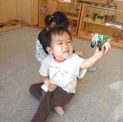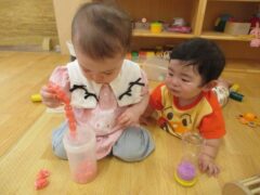 指を上手に使って摘まんだり握ったり出来るようになり、遊びも少しずつ広がっています。