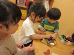 簡単なボードゲームを保育士に教えてもらいながら友達と一緒に楽しんでいます。