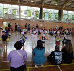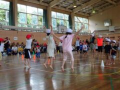 曲に合わせて踊り、曲が止まったらかごを狙って玉入れをします。