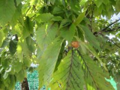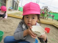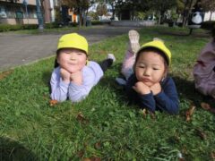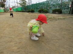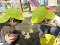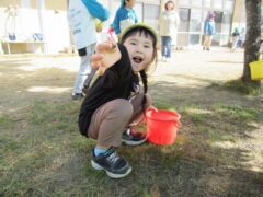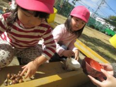 園庭でどんぐり探しを楽しむひよこさん。