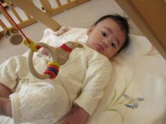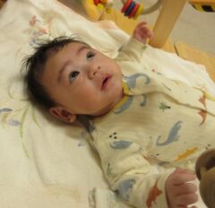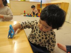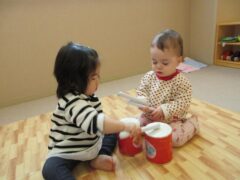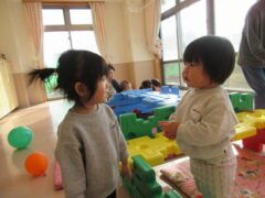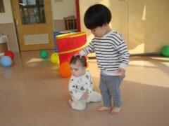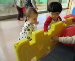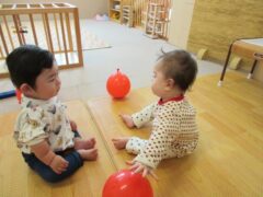 たまご組のお部屋では、友達と顔を見合わせて笑ったり興味のある玩具を一緒に触ってみたりと微笑ましい姿がたくさん見られていますよ。