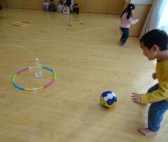 ボールを蹴ってペットボトルを倒すゲームは、とても盛り上がりました。