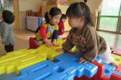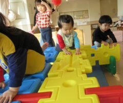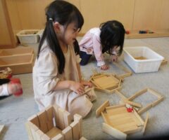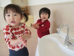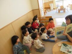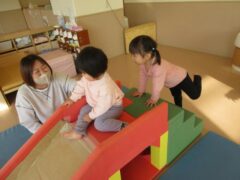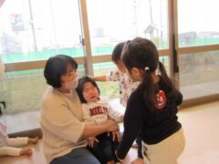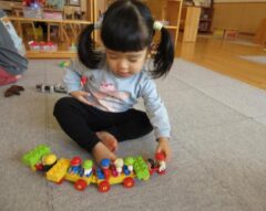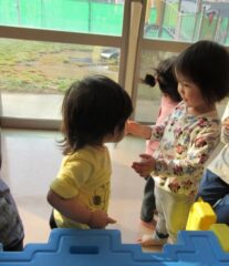 ひよこ組のお部屋では、小さいたまご組のお友達一緒に遊んでいました。