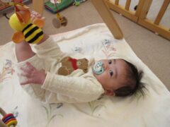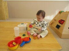 たまご組のお部屋では、月齢に合わせた玩具でじっくり遊び、一日を一人一人のペースに合わせてゆったりと過ごしています。
