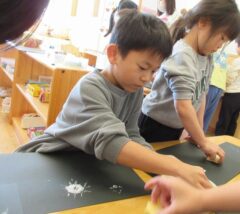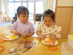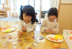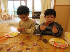 お部屋では散歩で見つけた落ち葉を使ってお家の方へのプレゼント作りをしていました。