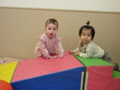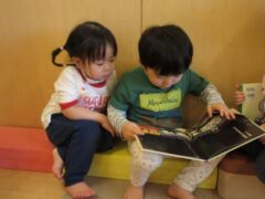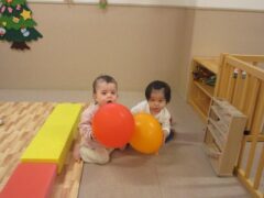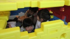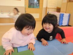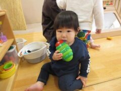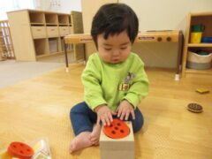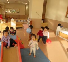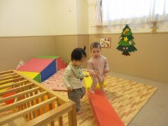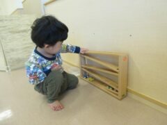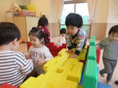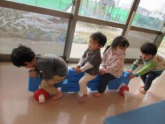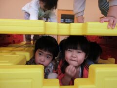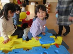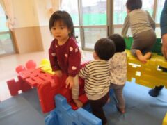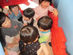 大好きな大型パネルで作った家に入ったり、車でお出かけしたりと、体をたくさん動かして遊んでいます。