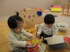指先を使った玩具で夢中で遊ぶひよこさん。