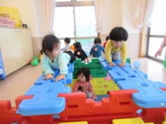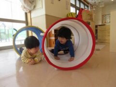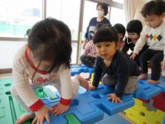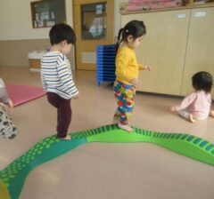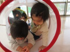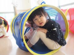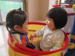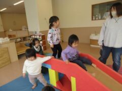 ひよこさんはマルチパネルやすべり台など、全身を使い大型遊具で遊んでいます。